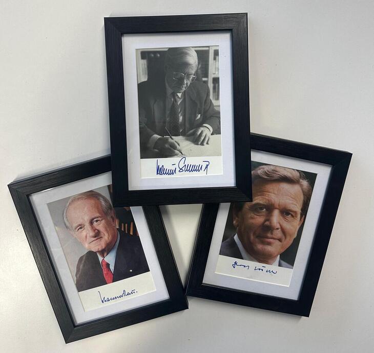 Dieses Autogramm-Set bringt drei herausragende Gestalten der deutschen Politik zusammen: Helmut Schmidt, Johannes Rau und Gerhard Schröder