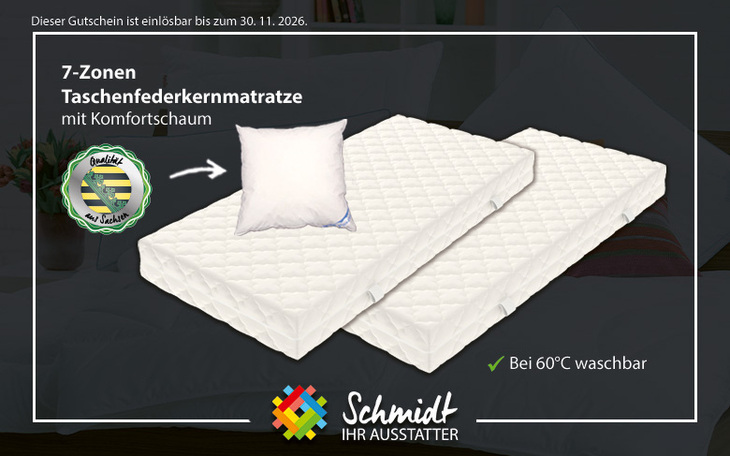 Mit diesem Gutschein erhalten Sie die Matratze Schlummerstunde im Doppelpack, sowie ein hochwertiges Kopfkissen mit 1000g Gänsefedern von einem regionalen sächsischen Hersteller. Die Matratzen vereinen weichen Komfortschaum mit einem hochwertigen 7-Zonen-Taschenfederkern für optimalen Schlafkomfort. Der Komfortschaum sorgt für ein angenehmes Liegegefühl, während der Federkern mit 256 Federn pro m² eine anatomisch korrekte Körperlagerung unterstützt. Eine zusätzliche Versteppung mit Vlieswatte rundet das angenehme Schlafklima perfekt ab.