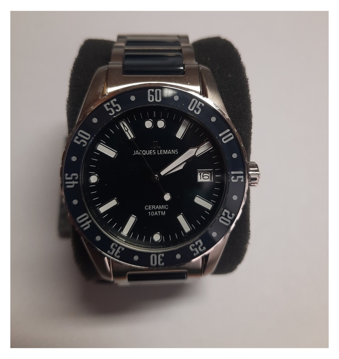 Gehäuse und Band Edelstahl und teilweise mit High Tech Keramik blau
