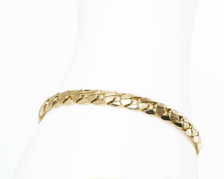 Mit einem Gewicht von 21,2 Gramm begeistert das Goldarmband als Accessoire, das zu jeder Gelegenheit überzeugt. Bei festlichen Anlässen zur eleganten Garderobe trumpft es gleichermaßen eindrucksvoll auf, wie zu einem Casual Business-Outfit im Büro. Wie bei all unseren Schmuckstücken ist auch dieses Goldarmband aufwändig aufgearbeitet worden, sodass sich optisch kein Unterschied zu neuwertigen Schmuckstücken feststellen lässt. Die Echtheit wurde durch unsere Experten in einem mehrteiligen Prozess geprüft – dieses Goldarmband mit Geschichte wird Sie mit seiner Raffinesse begeistern.