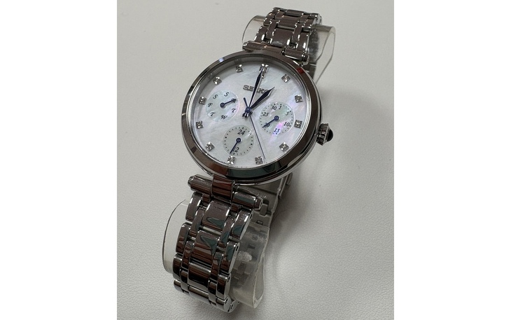 Perlmutt-Ziffernblatt mit 12 Diamanten und blauen Zeigern