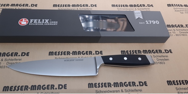 Das 21 cm lange Kochmesser von FELIX aus Solingen ist geschmiedet, robust und perfekt ausbalanciert. Der Doppelkropf schützt die Finger und sorgt für sichere Handhabung.