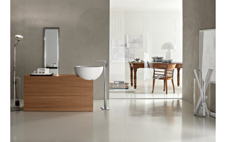 Das dezentriert platzierte Eckbecken auf der rechten Seite schafft eine klare,
