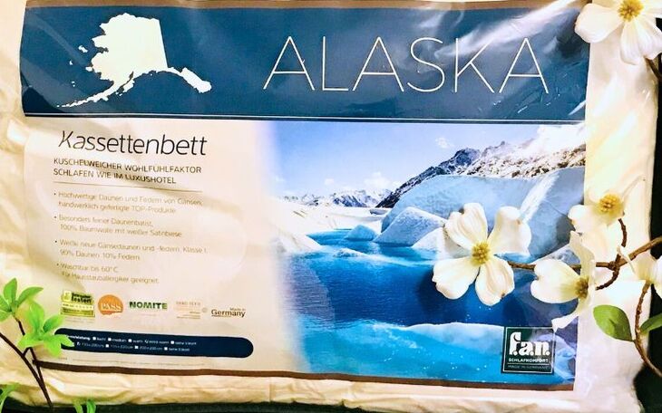 - Füllung: Weiße neue Gänsedaunen, Federn, Klasse I; 90 % Daunen, 10 % Federn 910 g