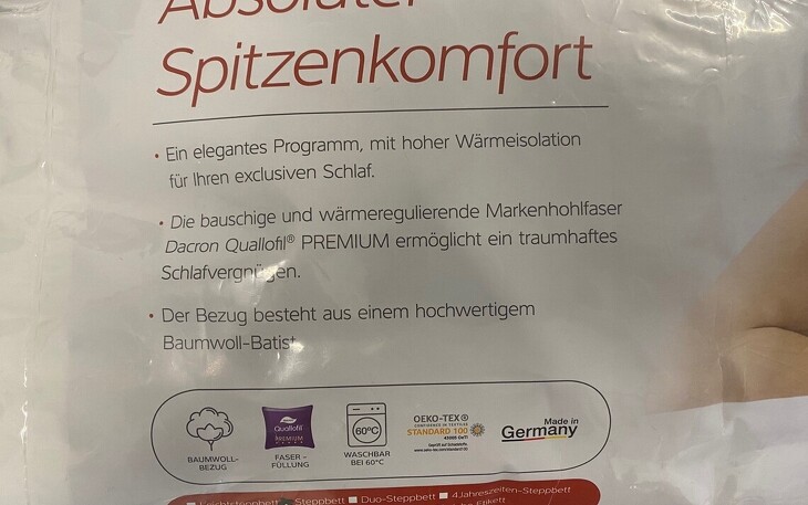 - Füllung: Dacron® Quallofil® PREMIUM, Markenhohlfaser silikonisiert (100 % Polyester)