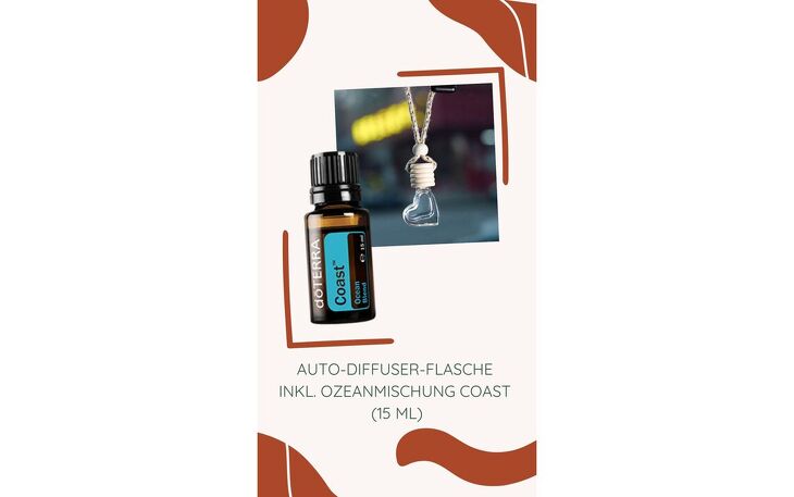 Dieser kleine Diffuser bringt Frische und Wohlgefühl in dein Auto. Die elegante Glasflasche mit Holzdeckel verströmt den Duft ganz natürlich und gleichmäßig, sobald sich das Fahrzeug bewegt. Mit der exklusiven Ozeanmischung Coast entsteht ein angenehmes Raumklima und ein Hauch von Meeresbrise begleitet dich auf jeder Fahrt. Stilvoll, natürlich und wunderbar praktisch für unterwegs.