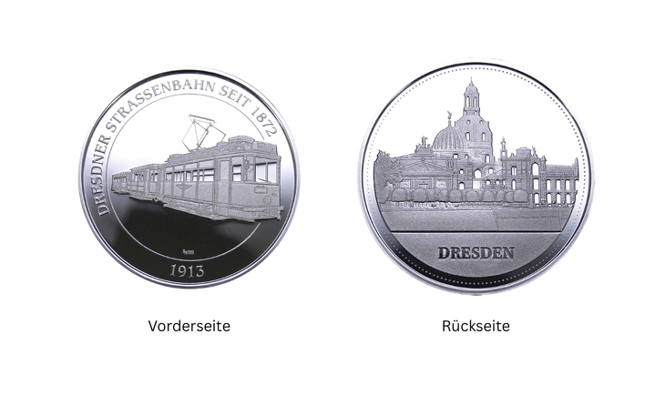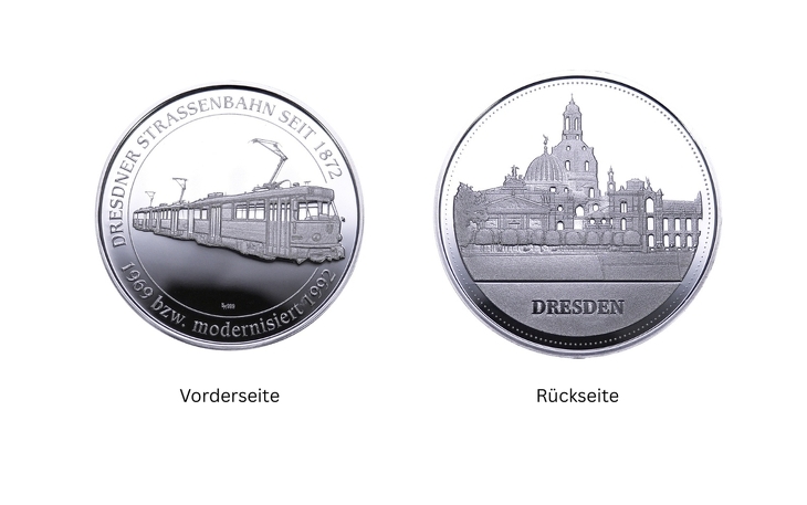 Vor über 150 Jahren, am 26. September 1872, nahm die erste Pferdebahn in Dresden ihren Betrieb auf. Mit ganzen 2 PS und 36 Sitzplätzen bewegte sich der damals innovative Pferdebahndecksitzwagen auf Schienen zwischen Blasewitz und dem Pirnaischen Platz. Anlässlich dieses Jubiläums entstand eine Serie von Sonderprägungen in Feinsilber – umgesetzt mit freundlicher Unterstützung der Dresdner Verkehrsbetriebe AG und des Straßenbahnmuseums e.V.