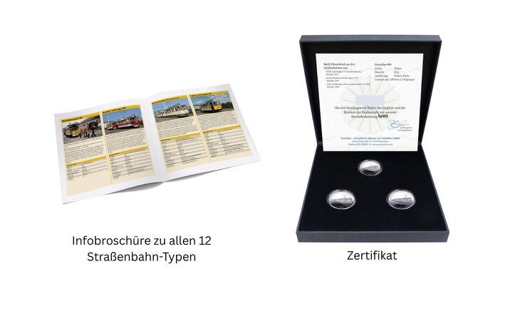 Das Set 2 enthält die limitierten Prägungen der Straßenbahnmodelle der Jahre 1913, 1962 und 1969 (modernisiert 1992).