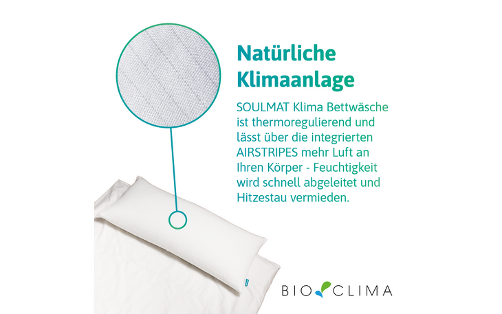 Der SOULMAT Klima Kopfkissenbezug ist thermoregulierend und lässt über die integrierten AirStripes (Lüftungskanäle) mehr Luft an Ihren Körper.