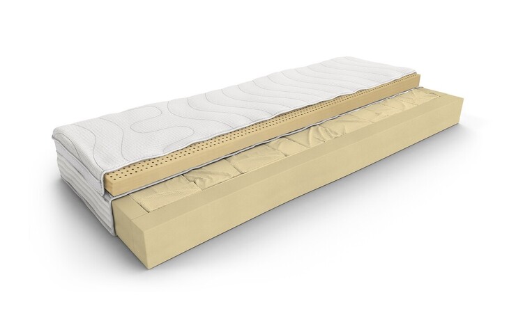 Sie erhalten eine individuell-körpergerecht angepasste Modulmatratze aus Naturlatex-Stützmodulen in drei verschiedenen Festigkeiten, mit einer aufgelegten Naturlatex-Topperschicht und hochwertigem, abnehm- und waschbarem Naturbezug aus 100% kbA-Baumwolle, Steppfüllung 100% Tencel.