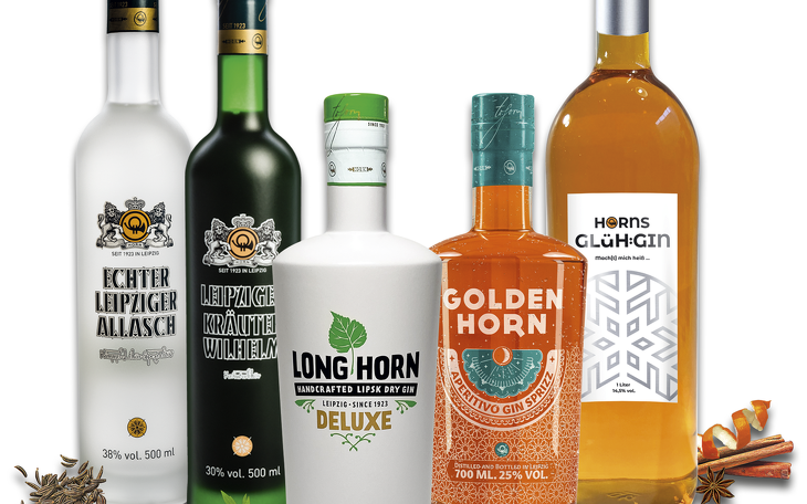 Typisch Leipzig: Wilhelm Horn steht für hochwertige Spirituosen – ungewöhnlich und lecker, traditionell und modern. Im Paket enthalten sind je 1 Flasche: Echter Leipziger Allasch, Long Horn Gin Deluxe, Horns Glüh Gin, Leipziger Kräuterwilhelm und Golden Horn.