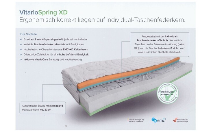 Sie erhalten eine individuell-körpergerecht angepasste Modulmatratze aus Tonnentaschen-Federkern-Stützmodulen in sechs verschiedenen Festigkeiten, mit aufgelegter Topperschicht und hochwertigem, abnehm- und waschbarem Bezug. Sie ermöglicht Ihnen ein wohlig entspanntes Liegen zur Vermeidung von Rückenschmerzen sowie einen bestmöglich erholsamen Schlaf durch eine ergonomische perfekte Matratze.