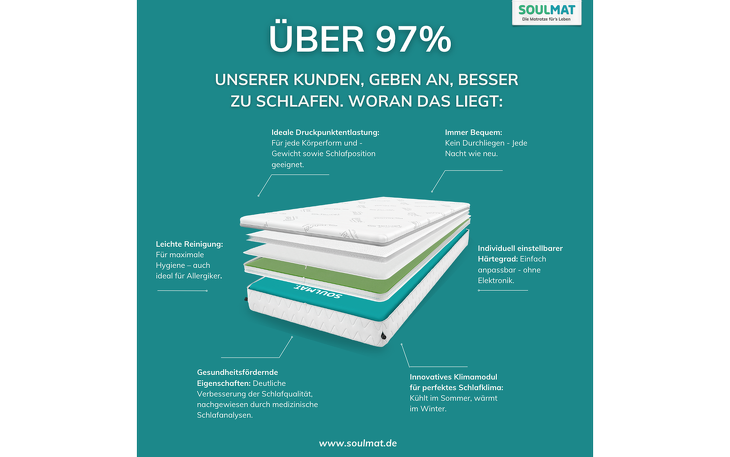 Die SOULMAT Matratze hat Erfinder Kay Steinbach im Jahr 2012 – in Zusammenarbeit mit der TU Dresden, Ärzten und Rückenspezialisten entwickelt. Erstes Aufsehen hatte die SOULMAT (Soul = Seele, Mat = Matratze) durch einen MDR Beitrag bei der Erfinder Sendung „einfach genial“ erregt. Bei der SOULMAT handelt es sich um ein Qualitätsprodukt aus Sachsen. In der Manufaktur in Döbeln, wird die SOULMAT in liebevoller Handarbeit für jeden Kunden individuell hergestellt. Auch bei den Zusatzartikel wie dem Kissen handelt es sich um echte Innovationen. Persönlich können Sie sich in den verschiedenen Showrooms (Radebeul, Döbeln, Leipzig, Chemnitz, Bautzen) von den Produkten überzeugen lassen.