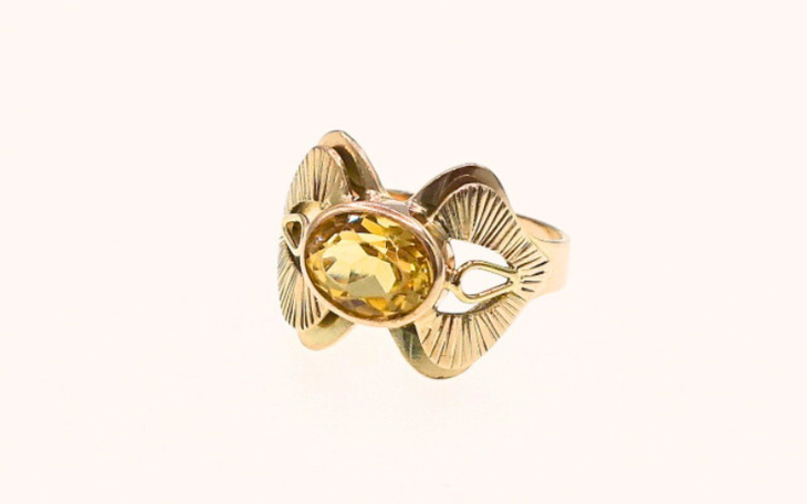 Zum Verkauf steht ein bezaubernder Goldring aus 333er Gelbgold (8 Karat), gefertigt um 1960. Im Mittelpunkt dieses charmanten Schmuckstücks steht ein leuchtender Zitrin, kunstvoll eingefasst als Zentrum einer stilisierten Blüte. Die plastisch ausgearbeiteten Blütenblätter aus strukturiertem Gold umrahmen den Edelstein und verleihen dem Ring eine besondere, nostalgische Eleganz.