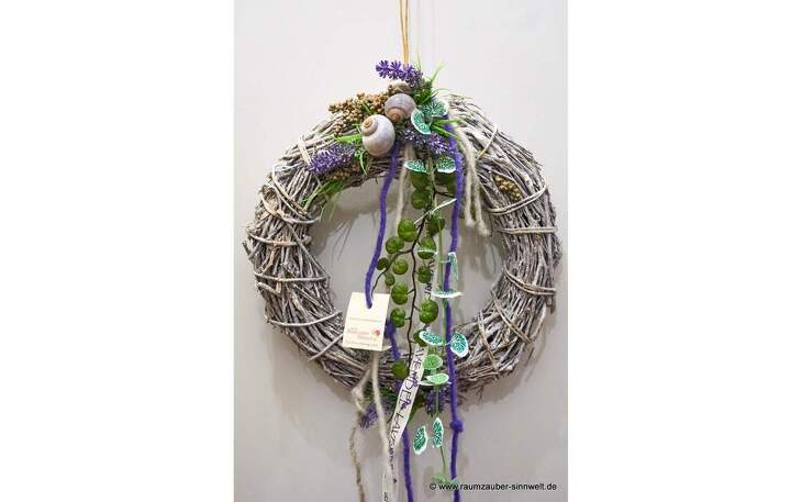 Weidenkranz mit Seidenblüten und Naturmaterialien dekoriert