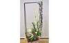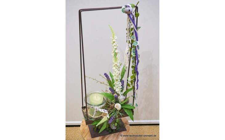 Metallständer mit Seidenblumen, Naturmaterialien und Kerze im Glasgefäß dekoriert.