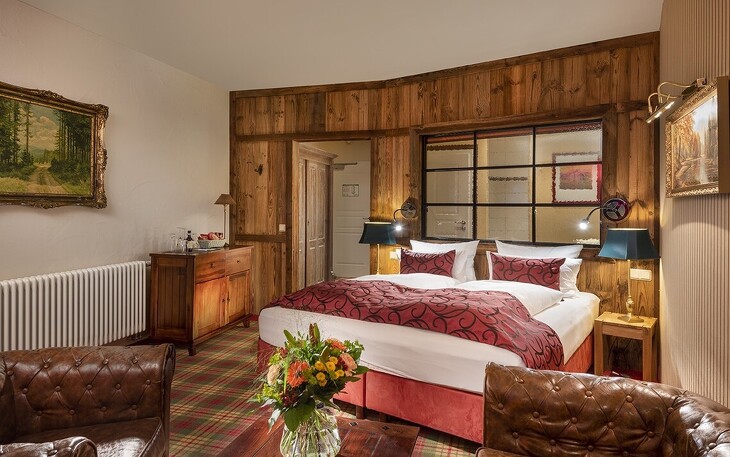Unsere Wellnesszimmer Deluxe sind sehr geräumige Zimmer im Landhausstil. Sie laden mit einer eigenen Terrasse oder Balkon zu gemütlichen Stunden im Grünen ein. In den Wellnesszimmern Deluxe erwarten Sie auf ca. 40 qm ein exklusiver Landhausstil mit viel Altholz, hochwertigen Materialien und kleinen Raffinessen. Stucco Pompeji, Gemälde, die scheinbar aus der Wand gearbeitet worden sind, verzieren den Raum mit Werken bekannter Meister. Ein schmiedeeisernes Fenster, raffiniert zwischen Wohnbereich und Wellness-Badezimmer platziert, lässt die Sonne auch in den hintersten Winkel des Bades scheinen.