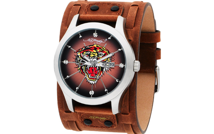 Diese Ed Hardy Armbanduhr mit mattem Edelstahl überzeugt mit einem markanten Logo, dem Tigerkopf, auf dem bräunlichen Zifferblatt.