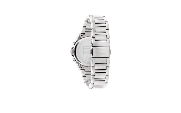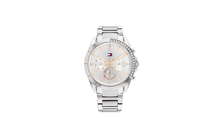Bringe dein Outfit zum Funkeln mit dieser Edelstahluhr von Tommy Hilfiger. Die Lünette ist zum Teil mit strahlenden Kristallen verziert welche sich vereinzelt im Zifferblatt wiederfinden. Die Multifunktionsuhr verfügt über eine 24 h Anzeige, Datum und Wochentags Anzeige.