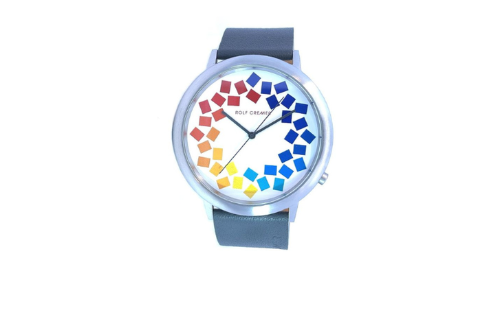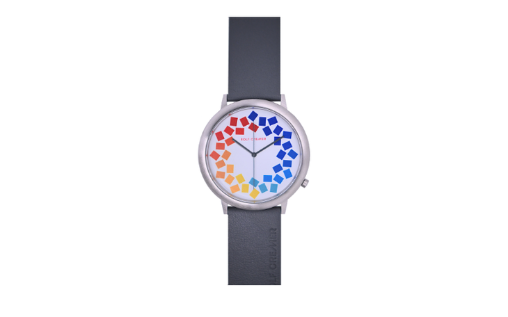 Als Highlight befinden sich auf dem matten weißen Zifferblatt kleine farbige Quadrate, die farblich aufeinander abgestimmt sind. Etwas Besonderes ist auch der doppeltlange weiße Sekundenzeiger.