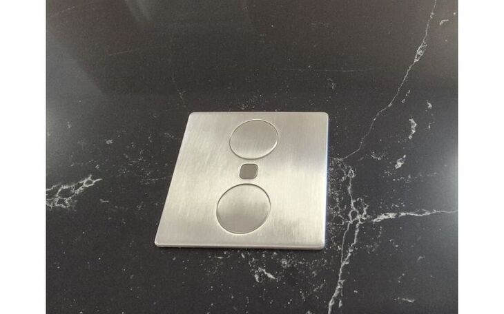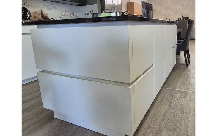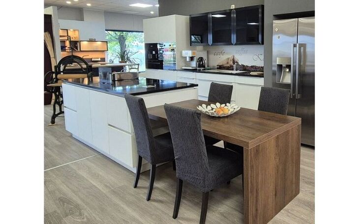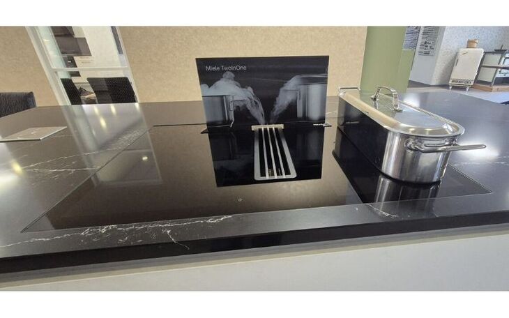 Die Vorführküche aus der Ausstellung ist eine Einbaubauküche mit Kochinsel sowie Kochfeldabsaugung und angesetztem Esstisch für 4 Personen, Arbeitsplatten Silestone Schwarz marmoriert, Villeroy & Boch Spüle, Geräteausstattung Miele und Siemens.