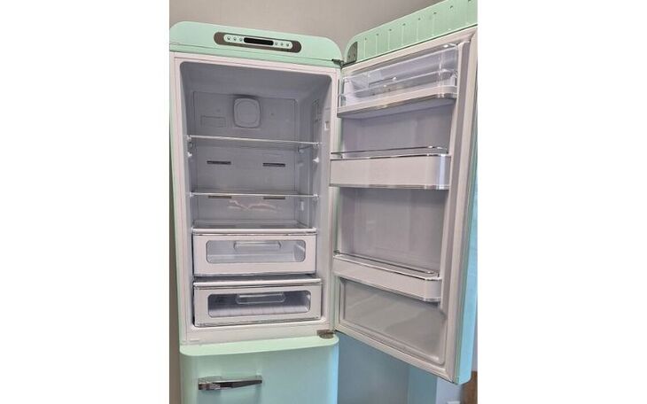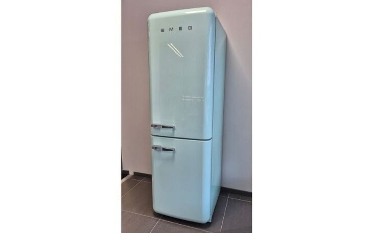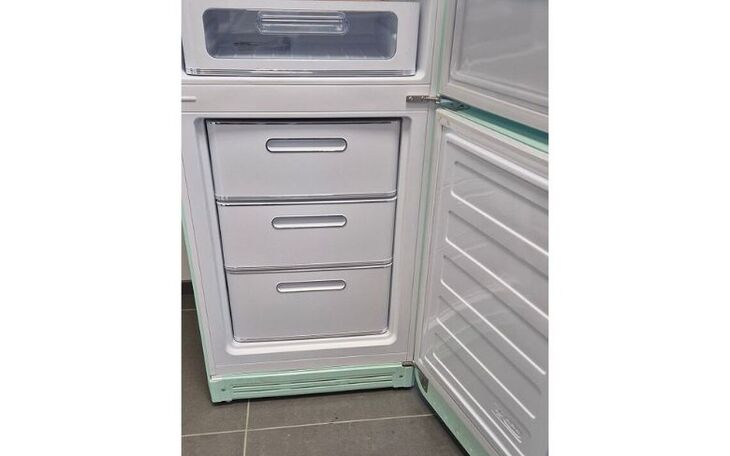 Das Ausstellungsgerät ist ein Design-Kühlgefriergerät der Marke Smeg in hellgrün.
