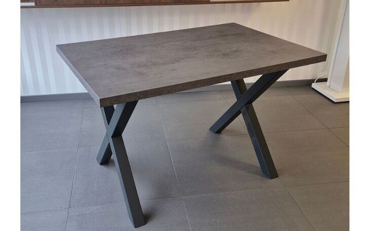 Erwerben Sie einen Esstisch mit Schichtstoffarbeitsplatte in Betonoptik und schwarzem Stahlfussgestell.