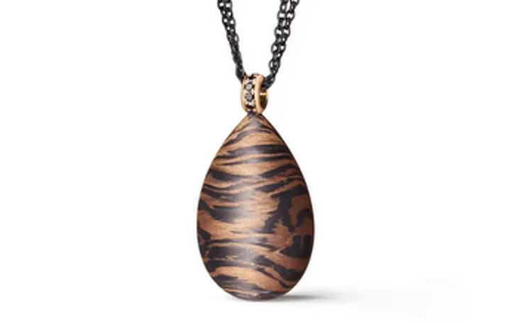 Dank des verwendeten Carbons ist die Kette besonders leicht und angenehm zu tragen. Der Anhänger wird von zehn kleinen schwarzen Diamanten (je 0,01 ct) gehalten, die dem Schmuckstück einen feinen, geheimnisvollen Glanz verleihen.