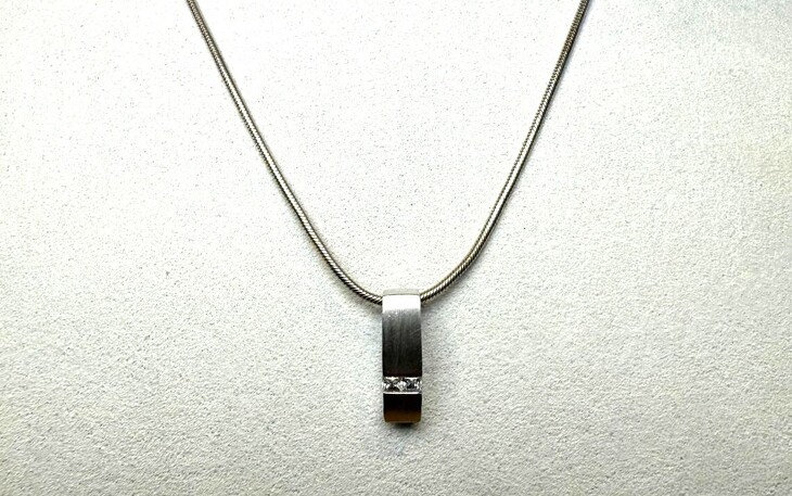 Der Anhänger aus 333 Weißgold präsentiert sich in matter Oberfläche und wird von zwei funkelnden Zirkonia-Steinen veredelt. Das dezente, moderne Design verleiht dem Schmuckstück eine zeitlose Ausstrahlung – ideal für jeden Anlass.