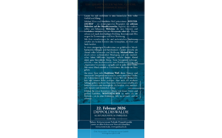 Es ist Winterzeit, aber die Herzen sehnen sich nach dem baldigen Frühling. Internationale Hits sorgen für Erinnerungen und beste Stimmung. Mit ihrer warmherzigen Art und authentischen Darbietung schaffen die beiden Künstler eine Atmosphäre, die Herz und Seele berührt. In einer einzigartigen Kombination aus gefühlvollen Mundharmonika-Klängen und berührenden Liedern entsteht ein Abend voller Sehnsucht und Hoffnung. Michael Hirte, der durch seinen authentischen Werdegang und sein musikalisches Talent Millionen begeistert, verleiht diesem Abend einen ganz besonderen Klang. Seine bewegende Lebensgeschichte – vom Straßenmusiker zum Publikumsliebling und „Supertalent“ Gewinner spiegelt sich in jeder Note wider. Mit seiner Musik erzählt er Geschichten, die direkt ins Herz gehen. An seiner Seite steht Madeleine Wolf, deren Stimme und emotionale Interpretation klassischer sowie moderner Lieder, die Zuhörerinnen und Zuhörer in eine Welt der Besinnlichkeit und inneren Ruhe entführt. Aber auch der moderne Schlager gehört zu ihrem Repertoire.