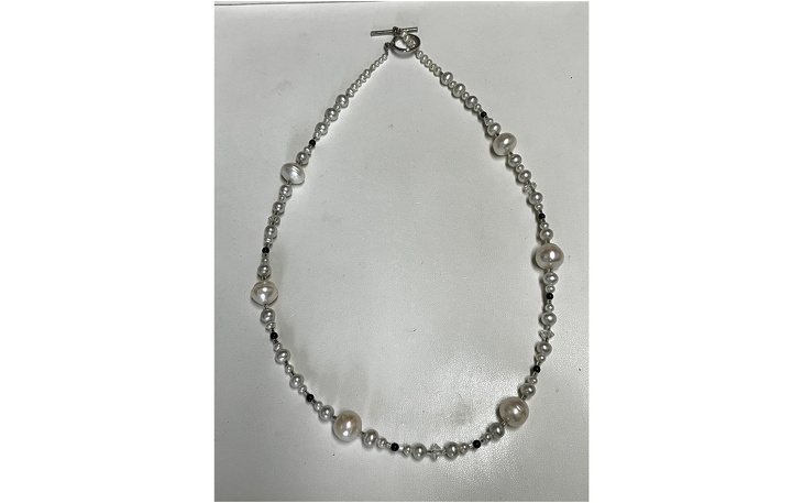 fein verlaufende Kette mit Süßwasserperlen, von 3mm bis 12mm. aufgefrischt it kleinen Kugeln in Onxy und Kristallröhrchen.