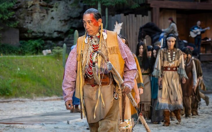 Die Live-Musik des indigenen Komponisten und Musikers Wade Fernandez verzaubert die Felsenbühne Rathen und lässt vor unseren Augen den Wilden Westen entstehen.