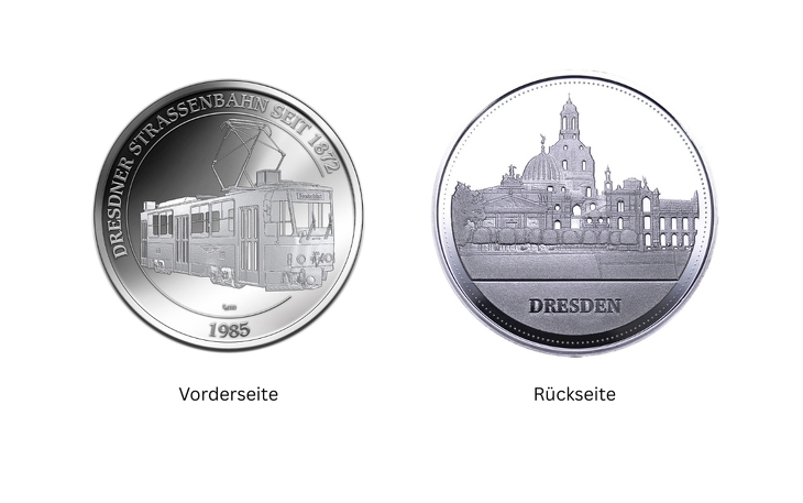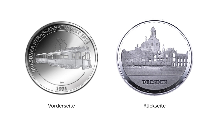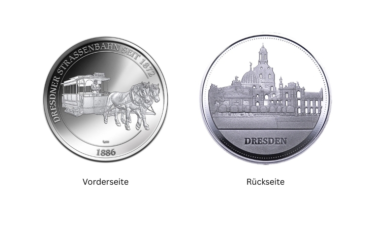 Vor über 150 Jahren, am 26. September 1872, nahm die erste Pferdebahn in Dresden ihren Betrieb auf. Mit ganzen 2 PS und 36 Sitzplätzen bewegte sich der damals innovative Pferdebahndecksitzwagen auf Schienen zwischen Blasewitz und dem Pirnaischen Platz. Anlässlich dieses Jubiläums entstand eine Serie von Sonderprägungen in Feinsilber – umgesetzt mit freundlicher Unterstützung der Dresdner Verkehrsbetriebe AG und des Straßenbahnmuseums e.V.