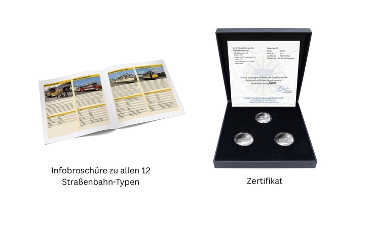 Das Set 4 enthält die limitierten Prägungen der Straßenbahnmodelle der Jahre 1886, 1931 und 1985.