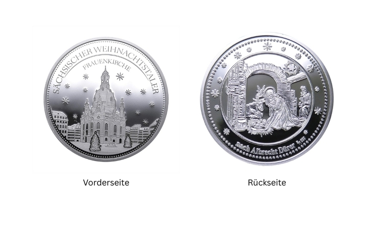 Die weltberühmte Dresdner Frauenkirche ziert diesen sächsischen Weihnachtstaler. Der monumentale protestantische Kirchenbau ist das alte und neue Wahrzeichen der Stadt. Durch das Schicksal der Zerstörung und den erfolgreichen Wiederaufbau ist die Dresdner Frauenkirche weltweit zu einem Symbol für Toleranz und Frieden geworden.