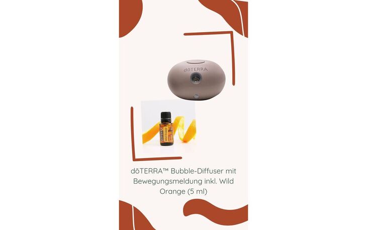 Der Bubble Diffuser von doTERRA erfüllt deinen Raum auf Knopfdruck mit angenehmem Duft – ganz ohne Wasser oder Kabel. Durch seinen integrierten Bewegungsmelder aktiviert er sich automatisch, wenn du vorbeigehst, und verströmt sofort den warmen, frischen Duft von Wild Orange. Das kompakte, stilvolle Design macht ihn ideal für kleine Räume, Arbeitsplätze oder gemütliche Ecken zu Hause. Perfekt für spontane Wohlfühlmomente und eine natürliche Duftatmosphäre.