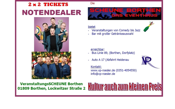 Wir bieten Ihnen 2 x 2 Tickets für die Veranstaltungen in der Veranstaltungsscheune Borthen:
