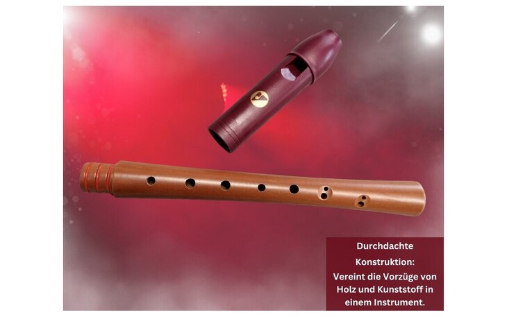 - Holzkorpus: nimmt Atemfeuchtigkeit auf (tropft nicht) und sorgt für die angenehme Haptik und den warmen Klangcharakter, den man von einer Holzblockflöte kennt.