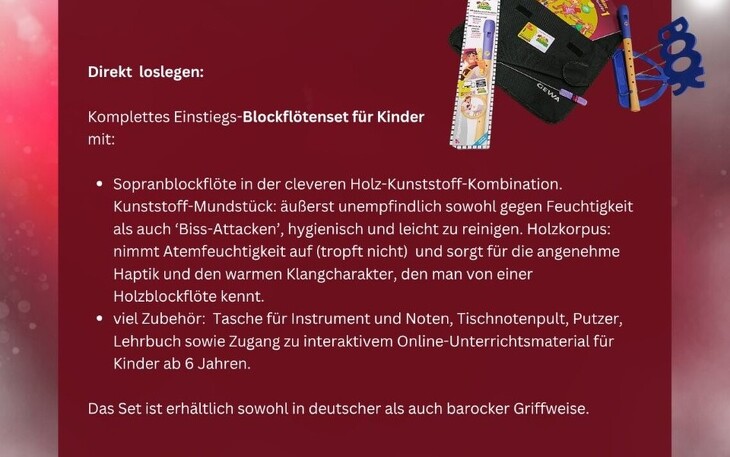 - viel Zubehör: Tasche für Instrument und Noten, Tischnotenpult, Putzer, Lehrbuch sowie Zugang zu interaktivem Online-Unterrichtsmaterial für Kinder ab 6 Jahren.