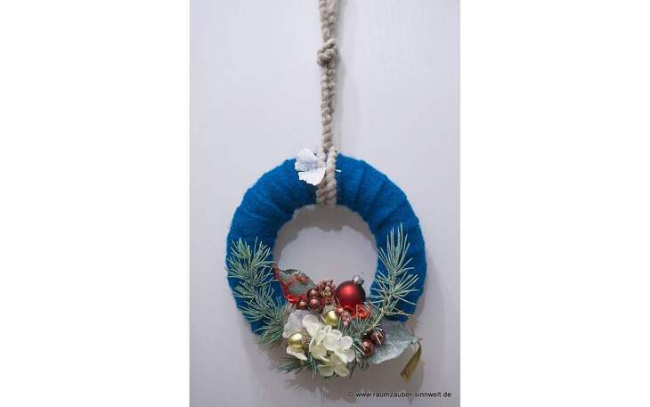 Die Wanddekoration besteht aus dunkelgrünem Filz, Seidenblüten und Adventskugeln und wurde von uns in künstlerischer Handarbeit selbst gefertigt.