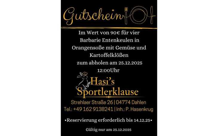 Festliche Entenkeulen in Orangensoße mit Gemüse und Kartoffelklößen zum Abholen am 25.12.2025 um 12:00 Uhr in Hasi´s Sportlerklause!