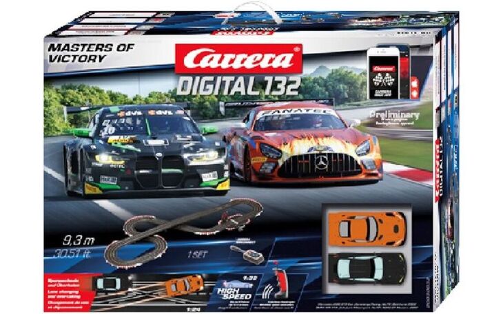 Pferdestärken-Biester an die Startlinie. Das einsteigerfreundliche Autorennbahn-Set beinhaltet den Mercedes AMG GT3 Evo "Sunenergy Racing" No 75 Bathurst 2022 in schickem Rot sowie den BMW M4 GT3 Schubert Motorsport No.10, der in Schwarz an die Startlinie rollt. Einsteiger-Set für Carrera-Liebhaber.
