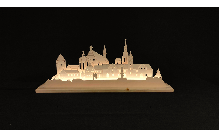 Dieser detailreiche Lichterbogen zeigt die eindrucksvolle Silhouette der Bergstadt Freiberg. Zu sehen sind unter anderem der imposante Dom St. Marien, die markante Petrikirche sowie die historischen Türme und Gebäude der Altstadt. Auch das Rathaus und die typischen Bürgerhäuser sind kunstvoll in Szene gesetzt. Die warm hinterleuchteten Konturen bringen die traditionsreiche Stadt besonders stimmungsvoll zur Geltung.