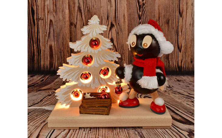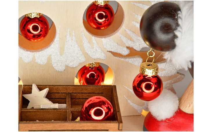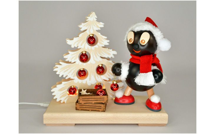 Wir präsentieren die beliebte Kultfigur Pitti beim Schmücken seines Weihnachtsbaumes. Die roten Echtglas-Kugeln müssen behutsam in den Tannenbaum gehängt werden. Die Tanne besteht aus hellem Birkensperrholz und ist mit glitzerndem Raureif veredelt. Sie ist indirekt beleuchtet und erzeugt eine stimmungsvolle Atmosphäre. Pitti ist komplett aus Hartholz gefertigt, ebenso die Grundplatte. Dieses Hartholz verhält sich besonders formstabil. Die Lasur haben wir so poliert, dass sie einen edlen seidenmatten Glanz entwickelt. Der charakteristische weiße Pelz auf Kopf und Armen kontrastiert zum dunklen Körper. Die beiden roten Schuhe tragen jeweils eine weiße Bommel. Die Stromversorgung über einen USB-A-Stecker ermöglicht eine dezentrale netzunabhängige Aufstellung, z.B. durch eine Powerbank.
