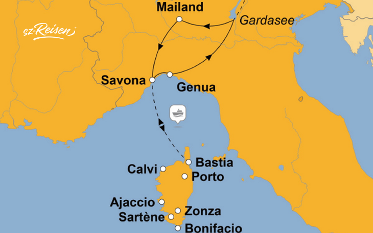 Auf unserer Busfahrt zur Fähre im italienischen Savona lernen Sie ganz nebenbei auch noch das wundervolle Mailand kennen, bevor Sie am dritten Tag die korsische Hauptstadt Bastia erreichen. Von hier aus startet Ihre Inselrundfahrt durch Weinberge und Kiwifelder mit Zwischenstopp in Bonifacio, wo Sie die mittelalterliche Zitadelle besichtigen und eine Bootsfahrt entlang der 80 Meter hohen Kalkfelsen unternehmen (fak.).