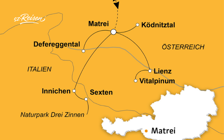 Von unserem idyllischen Ferienort Matrei gehen wir auf Entdeckungstour und lassen uns dabei nicht nur von der intakten Natur begeistern, sondern auch von der Sonnenstadt Lienz. Im Erlebnis- und Wohlfühlgarten "Vitalpinum" erleben wir mit allen Sinnen die wohltuende Kraft der Bergkräuter und tauchen im Defereggental sprichwörtlich in den heilsamen Zauber der alpinen Wasserwelten ein.