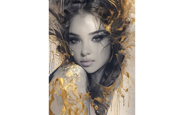 Die grau-schwarze Hautstruktur, fein modelliert und fast fotografisch präzise, steht im Kontrast zu den goldenen Pinselströmen, die sich wie Gedanken, Erinnerungen oder Energien um das Gesicht legen. Diese goldenen Elemente wirken wie Aura und Ornament zugleich – sie verleihen dem Werk eine spirituelle Tiefe und eine fast sakrale Präsenz.
