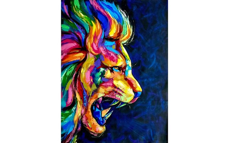 Kraft, Stolz, Wildheit – eingefangen in einem einzigen Moment. Mit „León“ erschafft der zeitgenössische Künstler Jose Mayo ein Porträt, das nicht nur den König der Tiere zeigt, sondern seine Seele in Farbe übersetzt. Der Löwe, im Profil dargestellt, brüllt nicht nur – er explodiert. Seine Mähne ist kein Fell, sondern ein Feuerwerk aus Rot, Blau, Gelb und Violett, das sich wie Emotionen über die Leinwand ergießt.