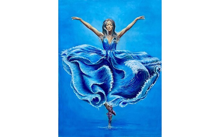 Die Komposition ist in intensivem Blau gehalten, das Tiefe und Ruhe ausstrahlt. Die Wellenstruktur des Kleides, detailreich und lebendig gemalt, verleiht dem Werk eine fast magische Dynamik – als würde der Wind selbst den Pinsel geführt haben. Die Tänzerin steht auf Spitze, leicht und kraftvoll zugleich, und verkörpert die Balance zwischen Kontrolle und Freiheit, wie sie nur das Meer kennt.